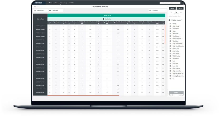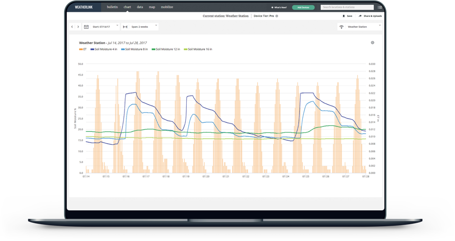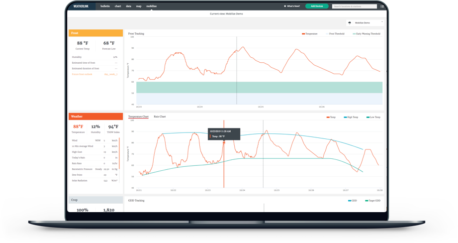 Build a custom weather dashboard of current conditions, analyze historical data in charts and data exports, make critical crop decisions using Mobilize or explore public station data from around the world — all with WeatherLink.