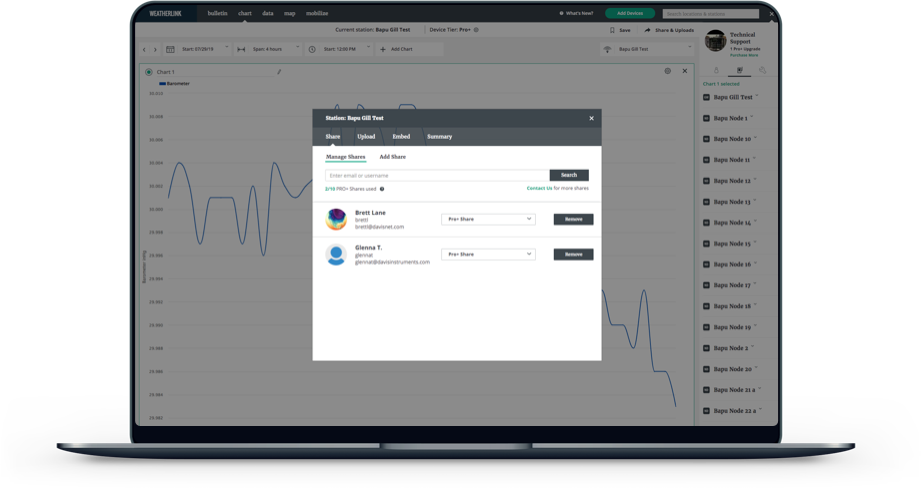 Install the sensors you need, where you need them. Weather station and sensors installed in Nodes report to a Gateway which sends the data to the WeatherLink Cloud. Intuitive apps and website let you access, analyze, and share your data on your smartphone, tablet, or computer.