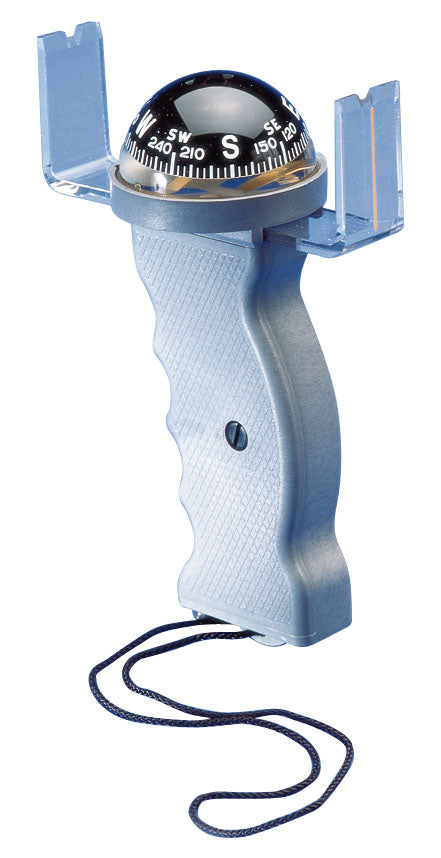 Using this precision marine hand bearing compass, you can easily obtain quick magnetic bearings on shore or floating objects. Simply align front and rear sights on an object and read off bearing. Uses include quick bearing or position set, determination of angular gain or loss on the competition while racing, checking distance offshore, establishing lee-bow set while cruising or racing in currents, drift vectoring and plotting a line of position. The stable, liquid-damped compass card is graduated in 5° segments, with bold graduations every 15° for easy reading. Solid-state LED illumination system floods the compass and sight vane with soft light. The LED will last for the lifetime of the compass. Instrument is lightweight, made of high impact plastic. Large, contoured handle designed for sure, steady grip and angled forward for added control. Positive “push-on” switching action, with vinyl boot water protection. Lanyard included. Battery housing has high watertight integrity. Batteries included. Complete instructions.