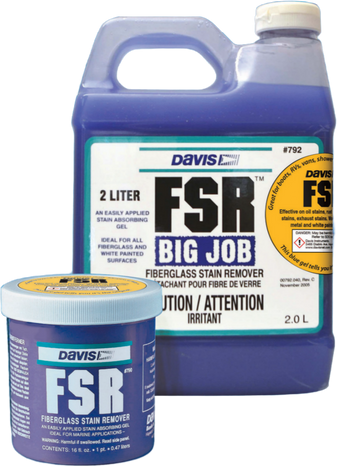 FSR is a unique stain absorbing gel that serves a variety of purposes both ashore and afloat. It's ideal for removing oil, rust, exhaust, waterline and transom stains, yet it can also be used anywhere else fiberglass stains may crop up—shower stalls, furniture, etc. Use for removing road soil from trailered boats and recreational vehicles. Its non-abrasive quality means that it's safe to use on white painted surfaces as well as on gel-coat. Requires no sanding or compounding. Simply apply with a brush, sponge or cloth. Wait a few minutes and then wipe off or rinse. USE ON SHOWERS AND SPAS, TOO.